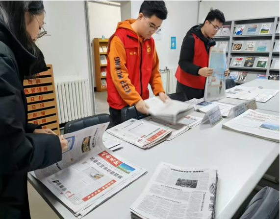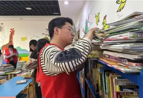 在图书馆,团员们化身“图书整理员”,分工协作、耐心细致地将散落书籍归位、报刊码放整齐。红马甲的身影在书架间穿梭,指尖拂去尘埃、理顺典籍,为读者点亮清晰阅读指引,用细微行动践行奉献初心。