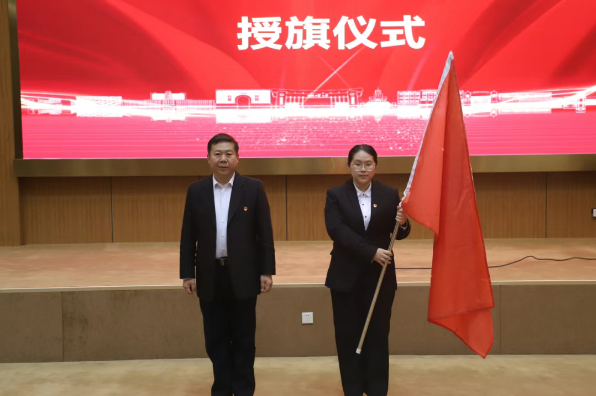 随后,学院党委书记杨占力为首届“党员示范班”授旗,班长刘佳鹭同志代表班级接旗。
