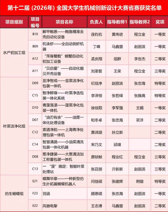 本届大赛以“灵巧·智能,美好生活”为主题,聚焦特定水产品初加工机械、叶菜洁净化处理包装一体化机械、高性能仿生蝴蝶三大创新方向。我院参赛学子立足农业现代化发展与仿生科技创新需求,将机械专业知识与工程实践深度融合,在资料评审、现场答辩、实物展示、功能演示等全流程中,展现出扎实的工程素养、严谨的科学态度和卓越的创新能力,其作品的实用性、创新性和前瞻性得到评审专家的高度评价与一致认可。