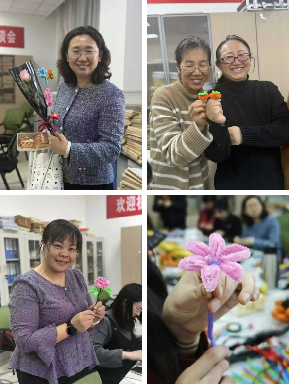 活动现场,老师们暂时放下繁忙的教学与科研工作,围坐一起,一边品尝香甜可口的茶点,一边话家常、聊生活、交流工作心得。在扭扭棒手工制作环节,大家兴致勃勃,一根根柔软的扭扭棒,在老师们灵巧的双手中,经过弯折、缠绕、塑形、组合,逐渐变成了一朵朵形态各异、栩栩如生的手工花,每一件作品都充满巧思与温情。老师们互相请教制作技巧,分享创作灵感,从生疏尝试到熟练操作,沉浸式体验手工创作的乐趣,用巧手“扭”出永不凋零的花朵,也定格下属于自己的节日浪漫。