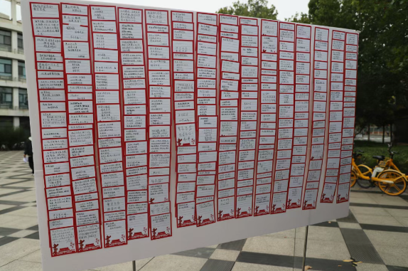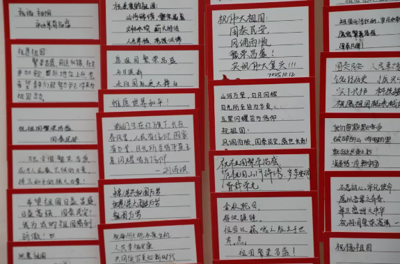 寻史打卡活动后,同学们来到大学生活动中心门口处参与“丹心寄语,共绘华章”活动,或书写贺卡,或创作绘画,通过不同的方式表达自己对于祖国母亲的美好祝愿。